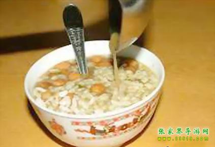 油茶湯對(duì)土家族人來說一日三餐少不了。土家油茶湯是張家界土家族具有代表性的包含文化現(xiàn)象之一,土家語稱“色斯?jié)缮?rdquo;,堪稱中國(guó)茶文化一絕,源遠(yuǎn)流長(zhǎng)。據(jù)清代的古書記載:“土人以油炸黃豆,包谷,米花,綠焦諸物,取水和油,煮茶葉和湯泡之,餉客致敬,名曰:‘油茶’”。