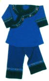 邊。男捆腰帶,女套繡花圍裙。頭上均包青布帕或絲帕,男帕左方垂一節(jié)過耳,婦女全包頭。未婚閨女留長發(fā)扎辮,用紅頭繩扎上下兩端,額前前留“劉海”。已婚婦女挽上發(fā)管,別簪,插銀首飾。褲子多為青、藍(lán)色、上結(jié)白布褲腰,褲腳短且大。青壯年男子打綁腿,女褲以對襯色布加邊,上綴三條均等的梅花條,腳上穿青布瓦鞋,包白色裹腳布。若遇喜慶節(jié)日或走親訪友,則另有一番梳妝打扮,如加佩牙簽、銀牌等。