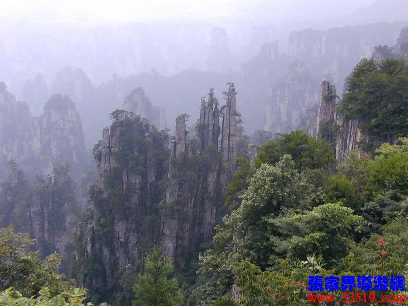 (大觀臺)這就是大觀臺。極目遠(yuǎn)眺,千百座奇峰盡收眼底。一位詩人說,武陵源的砂巖峰林是一步一觀景,千步千造型,一山有四季,十步不同天。專家測算出武陵源石峰有3103座。一如一位高超的雕塑大師,模擬宇宙萬物,無不形狀逼真,維妙維肖,栩栩如生,呼之欲動。有的如海螺出水,有的如金龜銜日,有的如蓮花盛開,有的如天橋橫空,有的如長槍刺天,有的如寶塔聳立,有的如老人采藥,有的如玉女梳妝,有的如將軍出征,有的如戰(zhàn)馬長嘯,有的如情人幽會,有的如夫妻相擁,有的如仙女散花,有的如村姑守望.....有的孤峰獨(dú)秀,有的直插云霄,有的婷婷玉立,有的威武勇猛,有的小巧玲瓏,有的大氣磅礴。進(jìn)入武陵源,但見一片峰的森林,峰的世界,峰的海洋。挺拔、奇秀、集中、原始、粗獷、古野。這就是武陵源。一位藝術(shù)大師說:武陵源的山峰,改寫了山的概念。大攝影家陳勃說:“三山五岳堪比美,華夏風(fēng)光每一流。”王繼杰先生說:“武陵源上三日游,勝讀千篇李杜詩。”許世杰先生說:“秀幽險峻稱奇絕,五岳黃山拜下風(fēng)。”李成瑞先生為此大抱不平:“神州勝景誰為最?須請霞公重評勘。”可惜徐霞客無緣到大觀臺來,也不可能為武陵源作甚評價了。