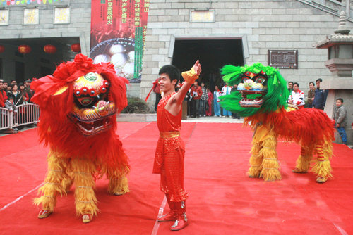 有布獅和毛獅兩種,舞時(shí)又分文獅和武獅。文獅刻畫獅子溫馴神態(tài),動(dòng)作詼諧細(xì)膩;武獅顯獅子勇猛,動(dòng)作幅度強(qiáng)。舞獅的套子有“藤纏樹”、“烏云蓋雪”、“牛戀凼”、“泥鰍彈鍋”、“麒麟送子”等。用打擊樂和吹奏樂伴奏、氣氛熱烈莊重。舞獅時(shí)還有贊獅者伴唱,唱詞內(nèi)容有反映勞動(dòng)生活、祝賀吉祥、介紹傳說(shuō)故事等,舞獅者隨唱詞內(nèi)容和節(jié)奏進(jìn)行表演。