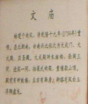 廟前面有學(xué)宮坪,亦名學(xué)坪,坪南端有大明壁。廟宇紅墻黃瓦,氣勢(shì)宏偉。正門曰奎星門,前院左右各植檜樹,常年翠綠,散發(fā)幽香??情T內(nèi)有月形泮池,池周護(hù)以石欄。泮池附近有石坊三座,正南石坊匾額鐫有“斯文在茲”四字,東西兩坊貫通街衢。通過石坊便是大成門。進(jìn)門左右是飛檐綠瓦的鐘鼓亭。大成門通向大成殿,有石鋪甬道直抵大殿臺(tái)基。臺(tái)高一米,全系石塊疊成。臺(tái)階分左右兩道,中有石雕盤龍,綴以云海波濤,栩栩如生,躍然石上。大成殿為歇山式重檐結(jié)構(gòu),周圍有16根圓石柱,內(nèi)外枋、檁、藻井、斗拱、扇梧均五彩施繪,黃瓦飛檐,蔚為壯觀。殿后有亞圣殿,與大成門、奎星門前后襯應(yīng),更顯出大成殿主體的雄偉。