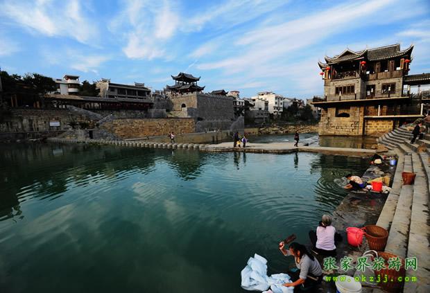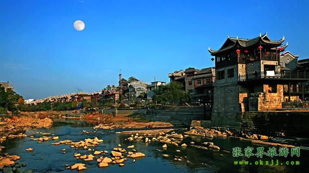 乾州古城城池小巧玲瓏,石城墻垣逶迤回環(huán)1980m,高5m,方溶江穿城而過,沿江古街上被歷代行人的腳磨得光亮的青石板,既自然又精巧地鑲嵌著,沿街建有苗族特有的民宅——吊腳樓,具有濃郁的民族風格。