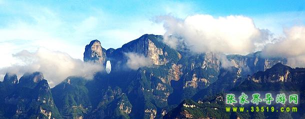 天門洞位于天門山山體的中上部,是世界上最高海拔的天然穿山溶洞,海拔1300米 ,其高131.5米,寬57米 ,深60米。它南北對開于千尋素壁之上,扶搖而通天,似明鏡似天門鑲嵌于蔚蔚天幕之上,終年吞云吐霧,蔚為壯觀中更加神秘莫測。“天門洞開云氣通,江東峨眉皆下風(fēng)”元朝的著名詩人張兌曾這樣贊嘆,磅礴的氣勢由此可見。1700多年來,這一道奇絕天下的勝景吸引著無數(shù)的探訪者趨之若騖。特別是在1999年,世界特技飛行大師架機(jī)穿越天門洞,在全球引發(fā)了轟動效應(yīng),收看現(xiàn)場直播的觀眾達(dá)到8億之多。