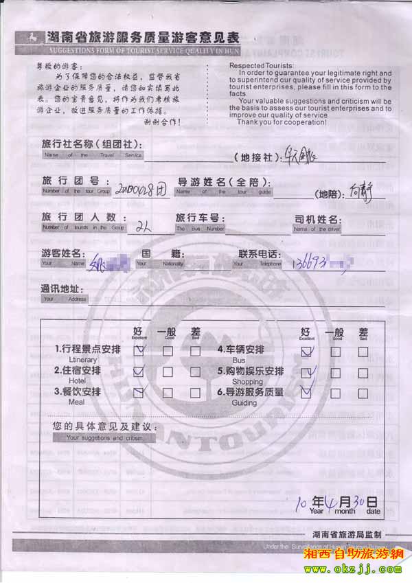 2010年4月30日姚先生一行2位旅游質(zhì)量反饋