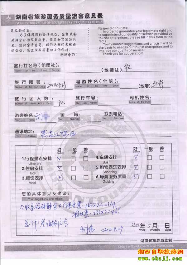 2010年5月1日黑龍江劉先生旅游質(zhì)量反饋