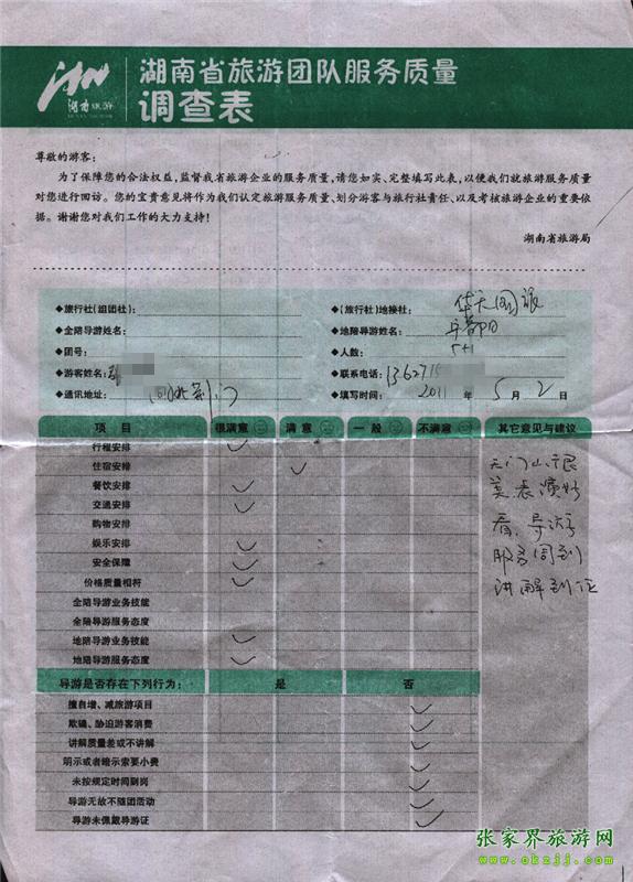 2011年5月2日張小姐一行6人旅游質(zhì)量反饋:天門山很美,表演好看,導游服務周到,講解到位