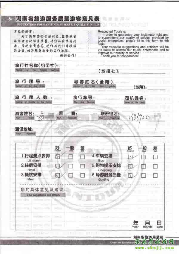 2010年9月25日張先生旅游質(zhì)量反饋