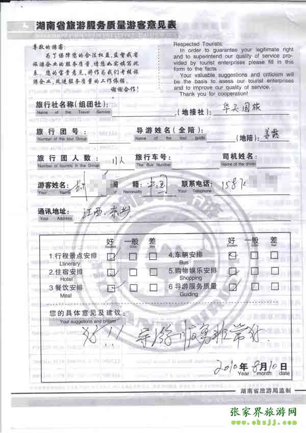 2010年8月10日江西胡先生一行11位旅游質(zhì)量反饋