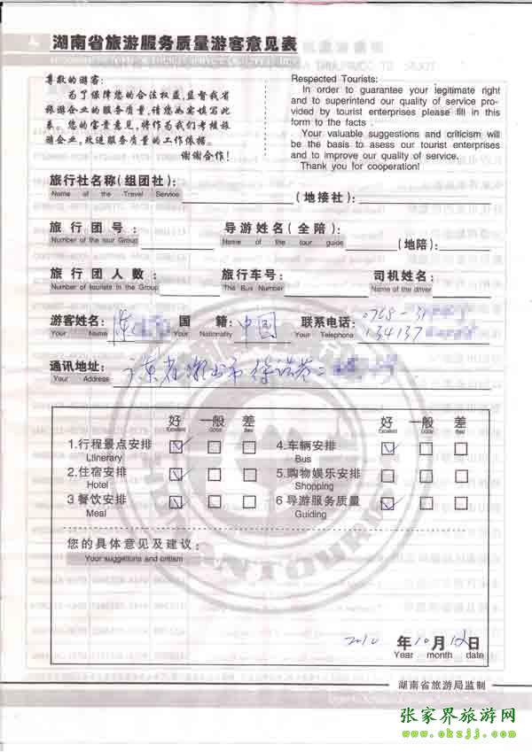 2010年10月12日廣東陳先生旅游質(zhì)量反饋