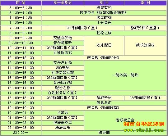張家界旅游交通頻道茲定于四月八號(hào)試播,頻率為FM93.2兆赫和103.2兆赫。頻道以立足旅游交通、服務(wù)百姓大眾為宗旨,設(shè)置了《清晨有約》、《順風(fēng)時(shí)刻》、《932新聞快報(bào)》、《輕松之旅》、《交通你我他》、《百姓服務(wù)站》、《歡樂總動(dòng)員》和《音樂隨車聽》等欄目。屆時(shí),聽眾可以通過(guò)熱線電話、短信平臺(tái)以及網(wǎng)絡(luò)廣播等多種途徑參與到電臺(tái)節(jié)目中來(lái),在第一時(shí)間了解新聞動(dòng)態(tài),掌握市場(chǎng)信息,享受娛樂休閑。 直播熱線:0744——2116999 熱線電話:0744——2116777 廣告熱線:0744——8235800 地址:張家界是永定區(qū)廣電局四樓(解放路27號(hào)) 怎樣收聽張家界旅游交通頻道FM93.2